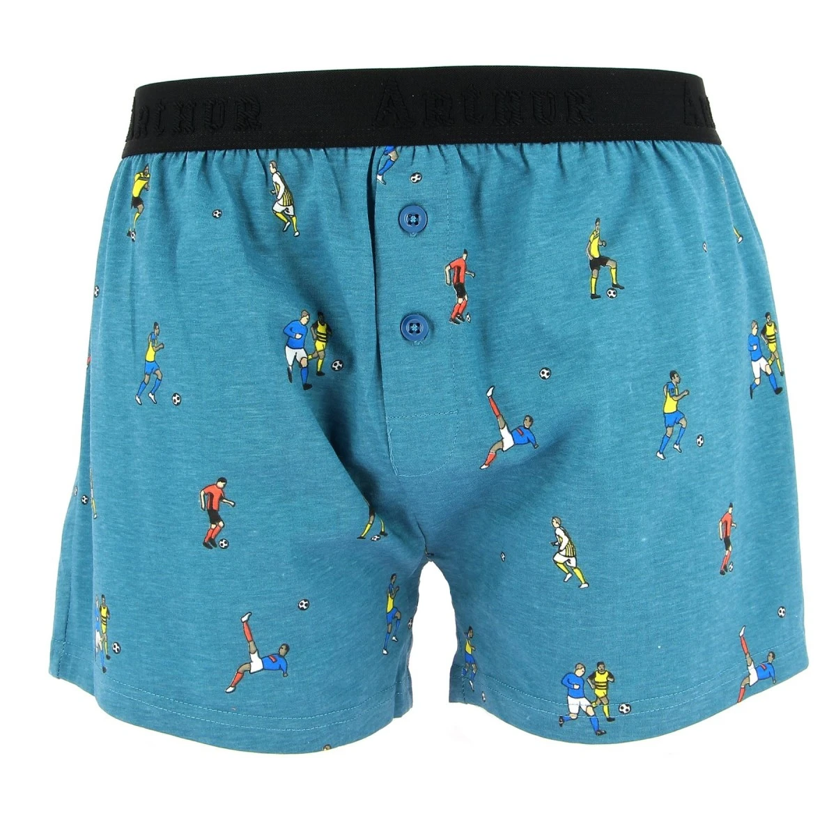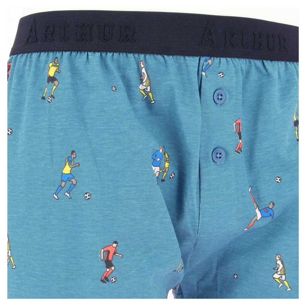 Caleçon homme ARTHUR, bleu canard imprimé joueur de foot. En 100% coton Jersey. Ceinture élastique noire avec marque en sur-impression. Fermé par boutons. Sans suspensoir.