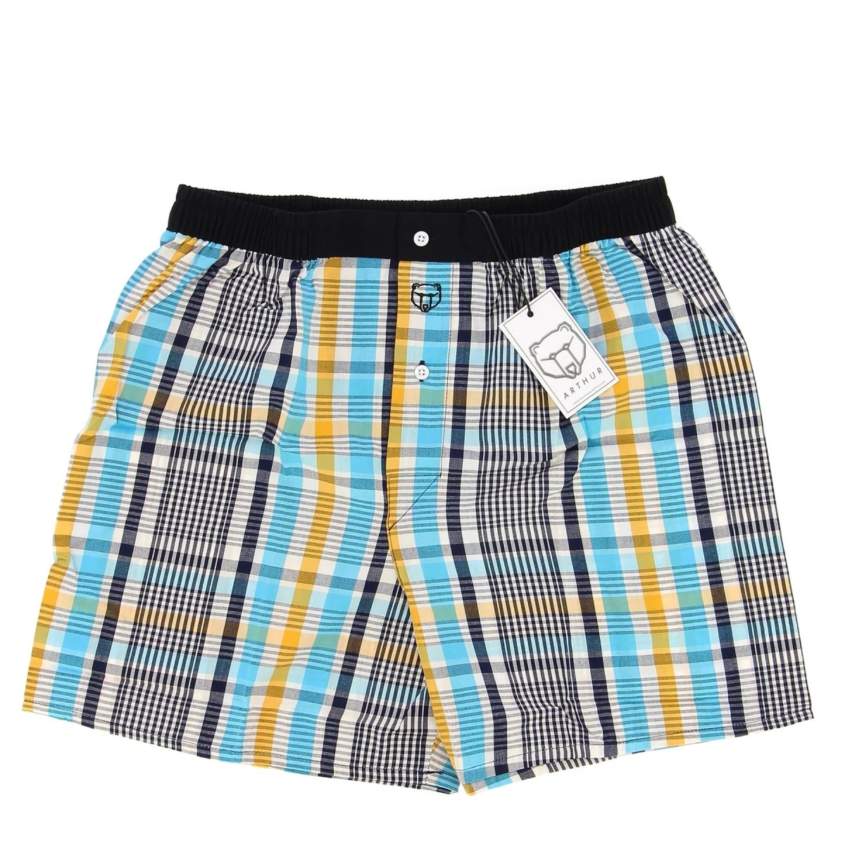 Caleçon ARTHUR, carreaux, coloris bleu et jaune. 100 % coton. Ceinture élastique et fermée par boutons. Sans suspensoir.