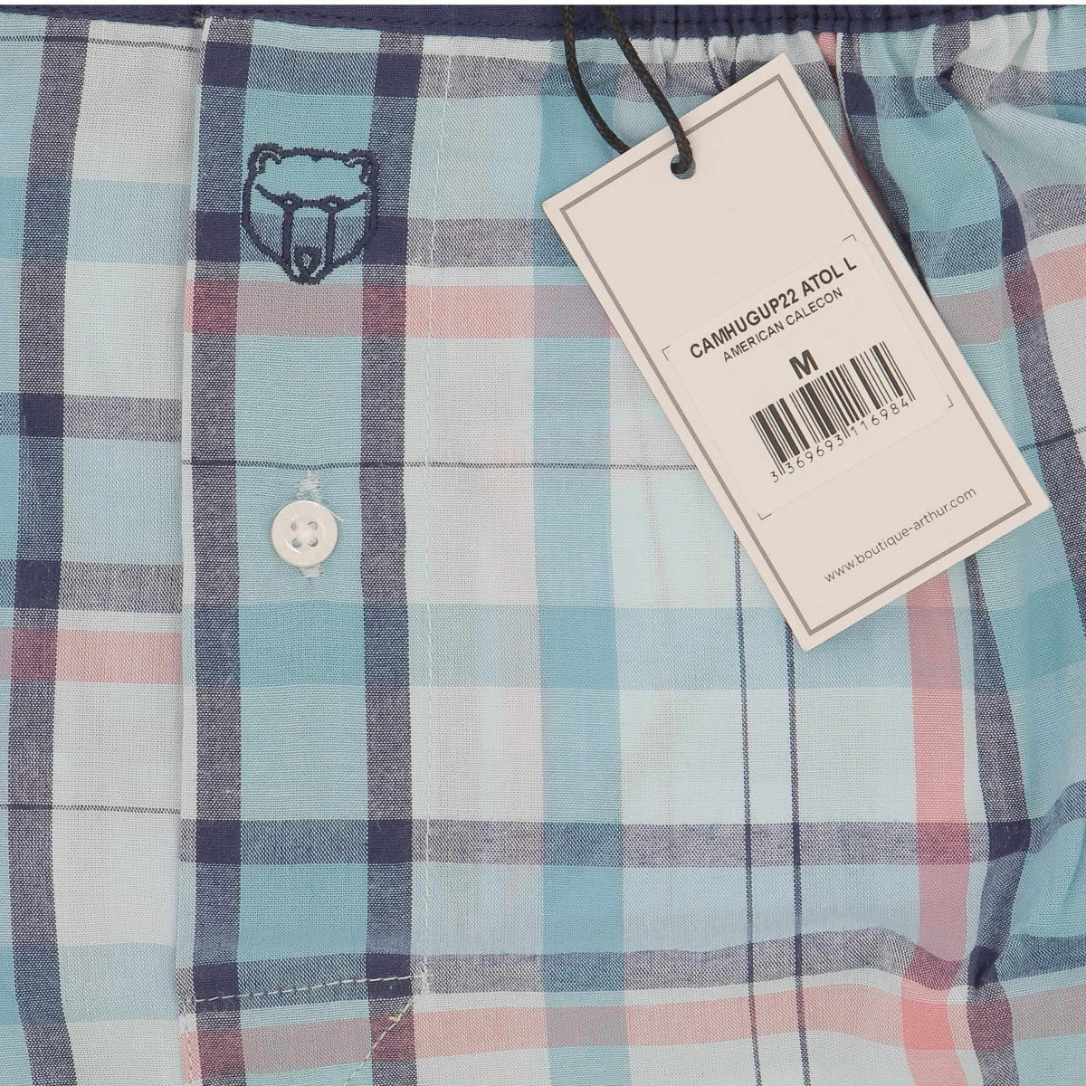 Caleçon ARTHUR, carreaux, écossais bleu et rose. 100 % coton. Ceinture élastique et fermée par boutons. Sans suspensoir.