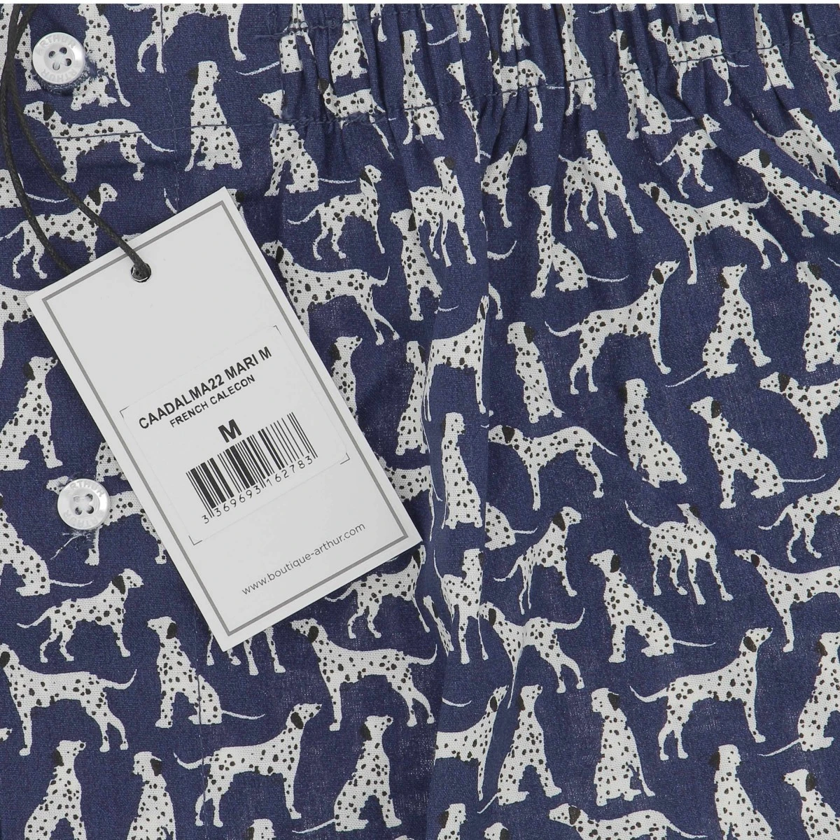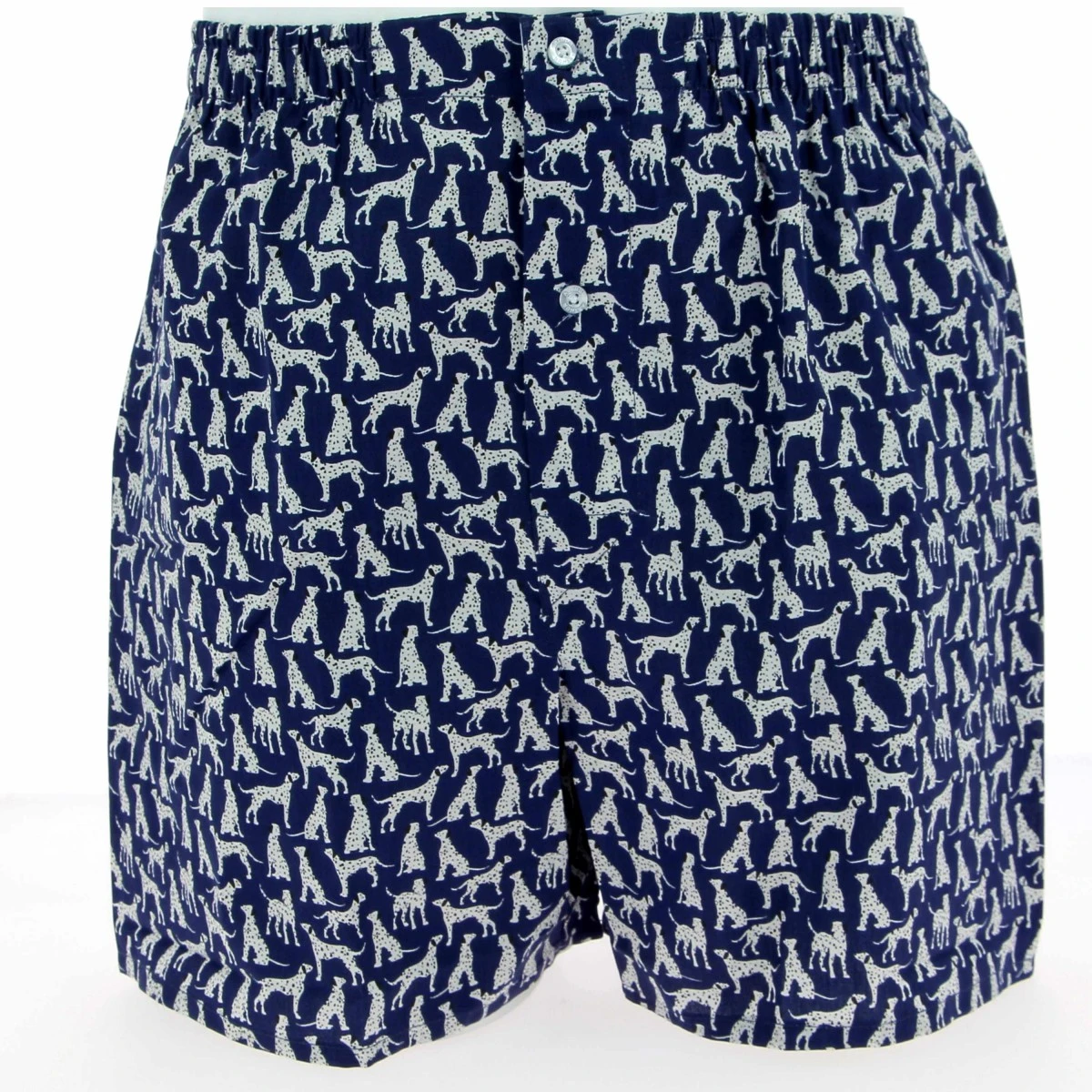 Caleçon homme ARTHUR, marine imprimé dalmatien. En 100% coton jersey doux et confortable. Ceinture élastiquée. Fermé par boutons. Sans suspensoir.