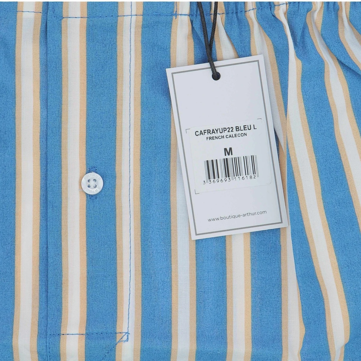 Caleçon ARTHUR, rayé bleu et jaune. 100 % coton. Ceinture élastique et fermée par boutons. Sans suspensoir.