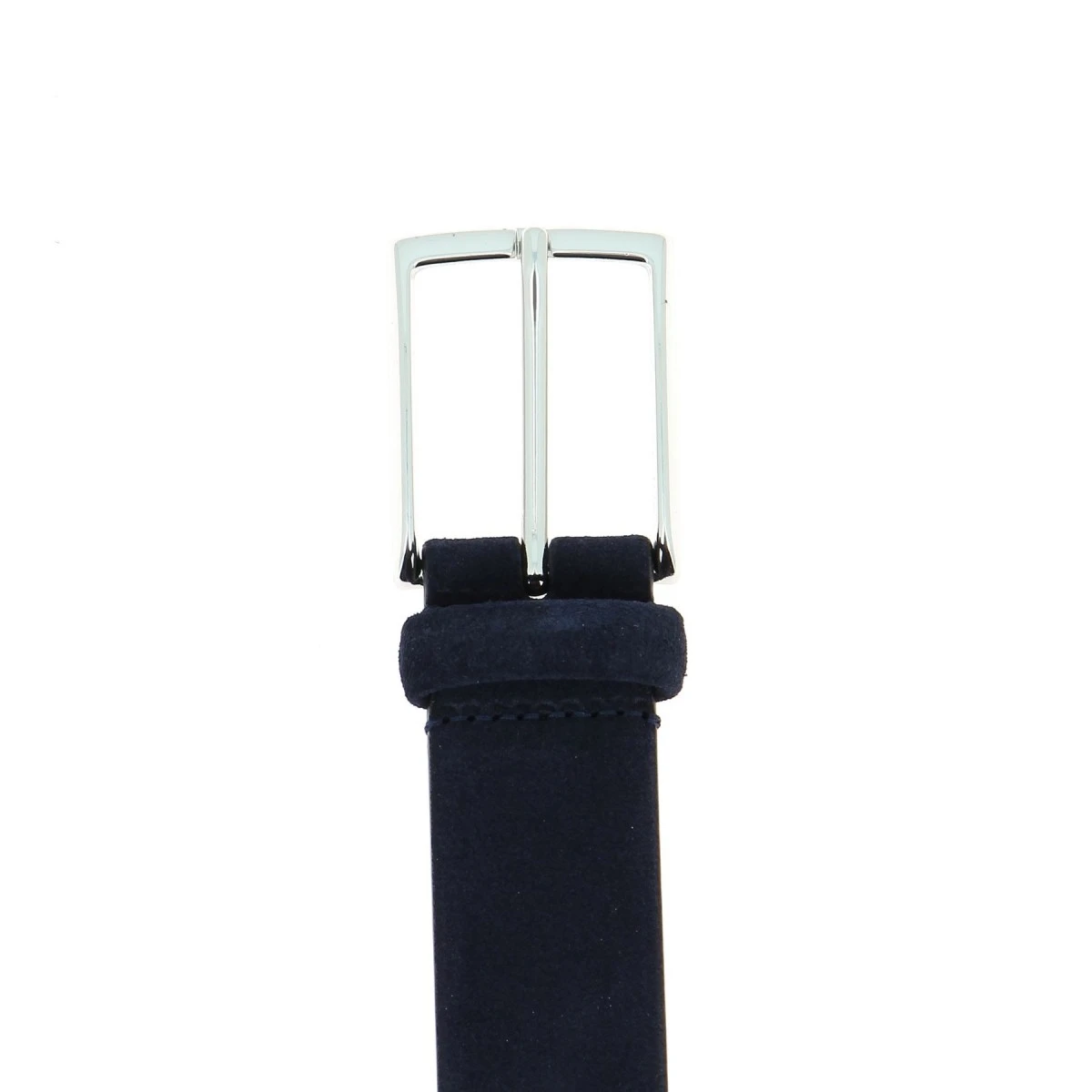 Ceinture Daim bleu marine, doublure cuir, fermée par une boucle carrée, avec un passant en cuir.