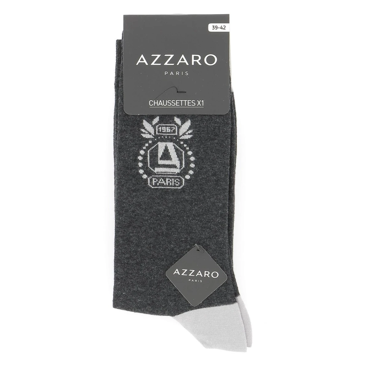 Célèbre marque de haute couture, Azzaro Paris 1967 vous propose ici des chaussettes mi- hautes pour homme, avec Logo de la marque. Couleur : noir/marine/gris.