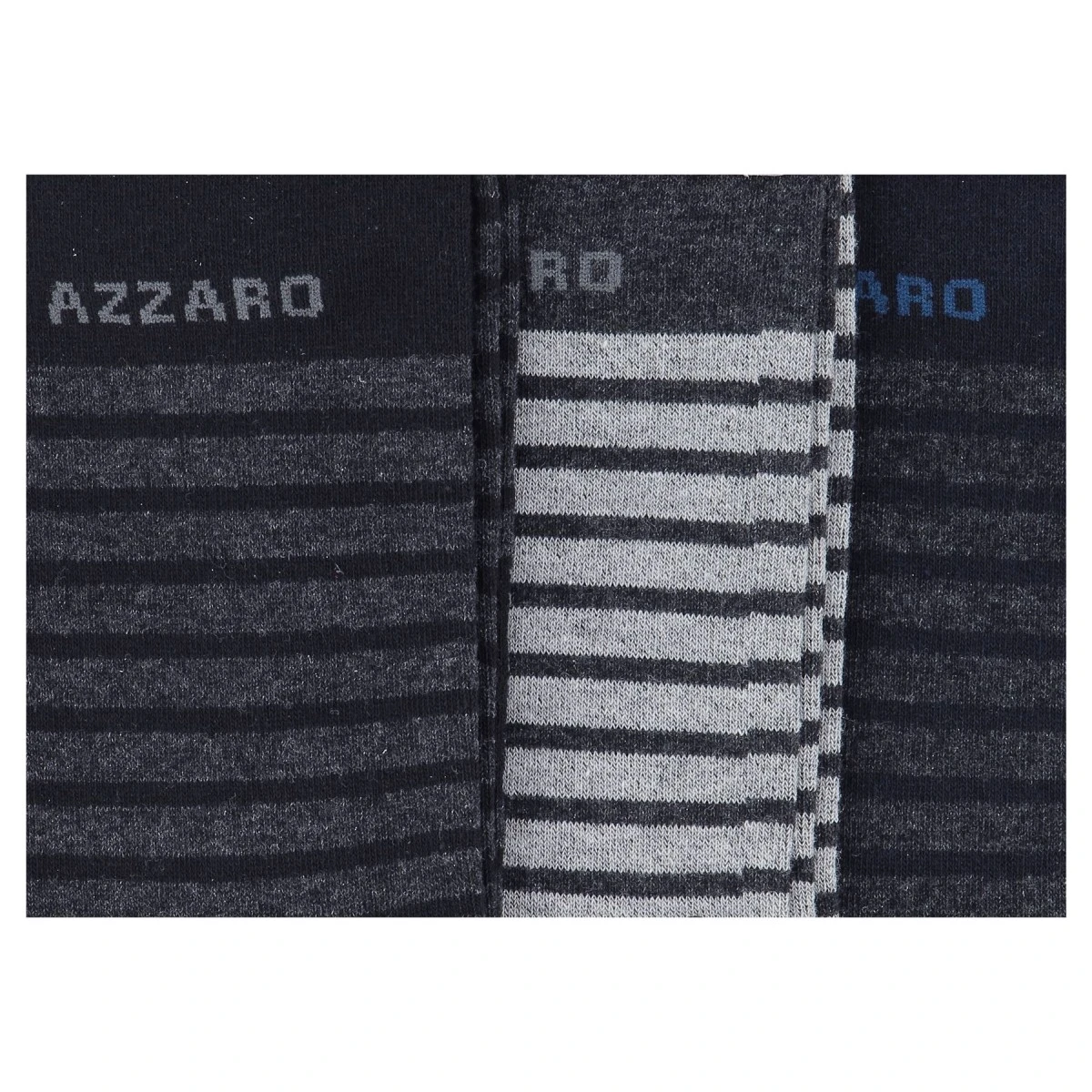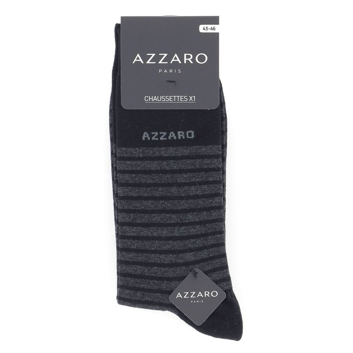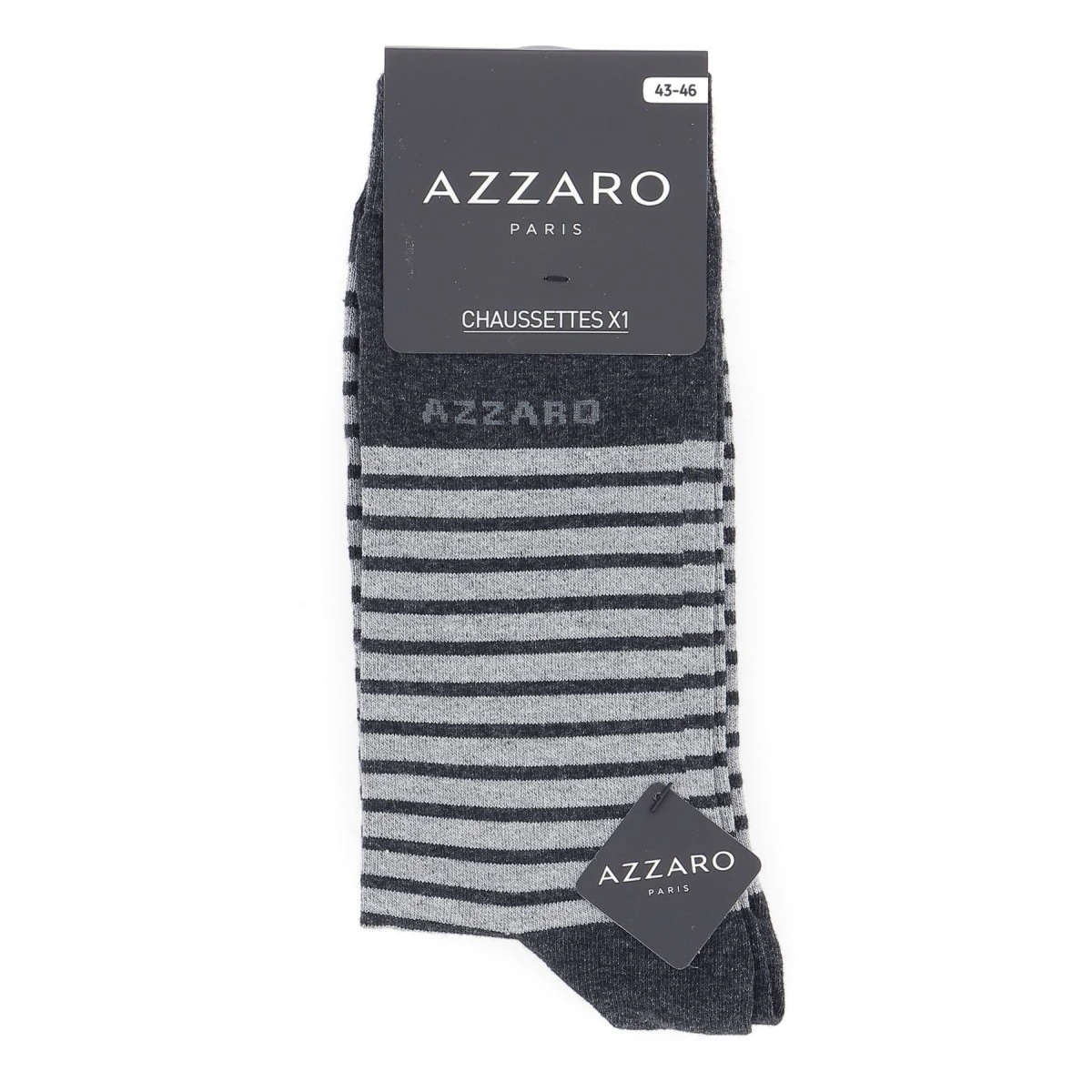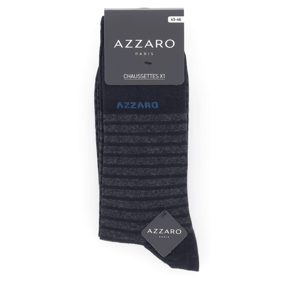 Célèbre marque de haute couture, AZZARO vous propose ici des chaussettes mi- hautes pour homme, couleurs : gris/noir/marine avec rayures et inscription marque.