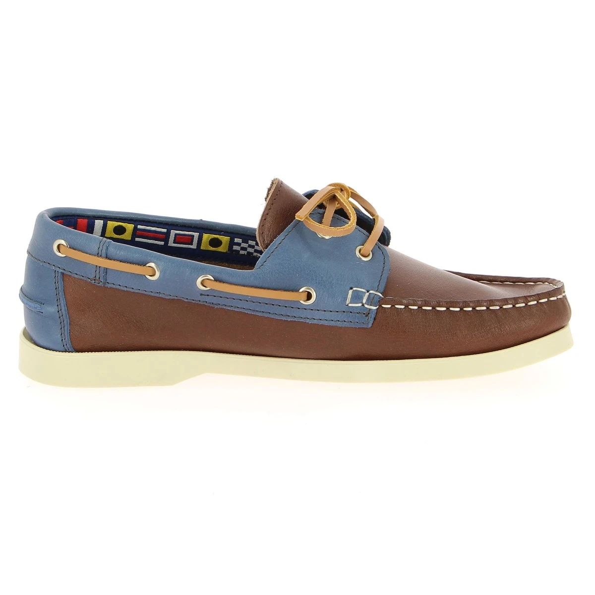 Chaussure bateau en cuir marron et bleu jean ; elle est un grand classique du dressing masculin. Reconnaissable à son lacet en cuir sur les côtés et à ses coutures apparentes, elle est à la fois décontractée et très chic. Un modèle incontournable pour les amateurs de voile ou tout simplement pour agrémenter une tenue détente, en jean ou bermuda. Semelle en gomme très confortable.