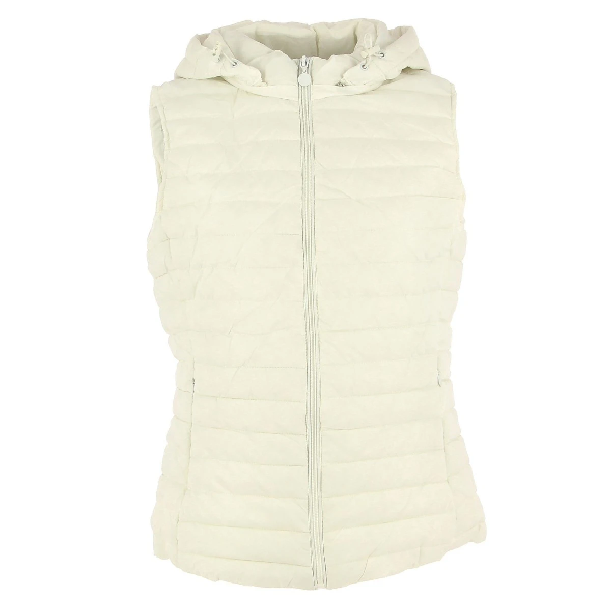 Doudoune sans manche Fashion Paris, coloris blanc, col montant, fermeture zippée, 2 poches zippées sur le devant. Capuche zippée amovible.