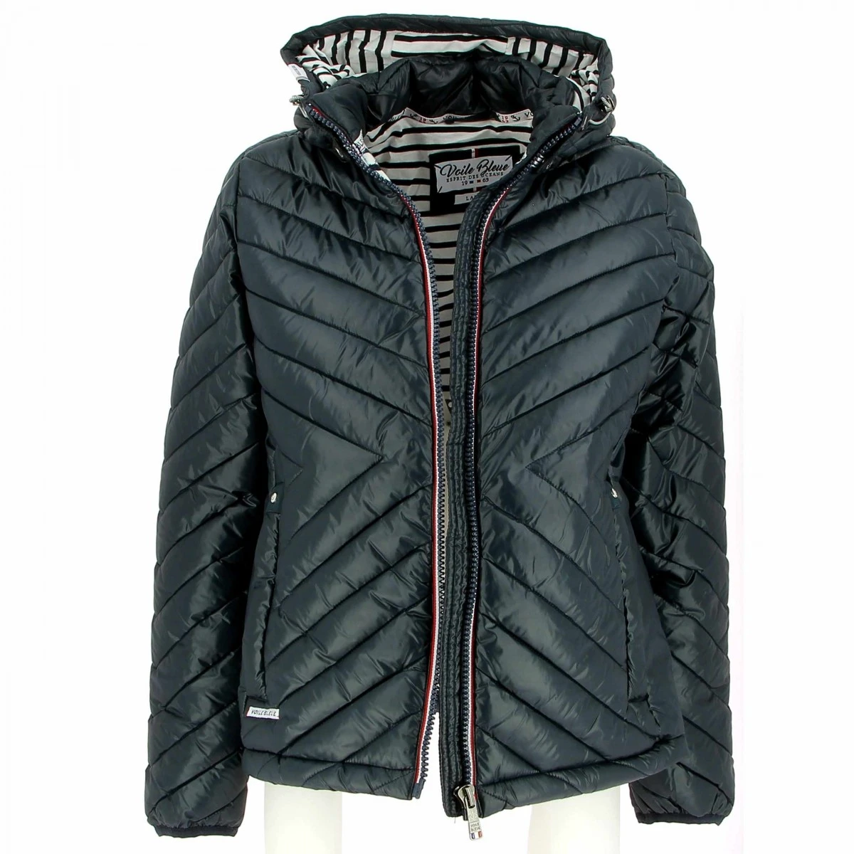 Doudoune femme VOILE BLEUE, coloris navy. Entièrement zippée avec liseré rouge et blanc tout au long de la fermeture éclair.
