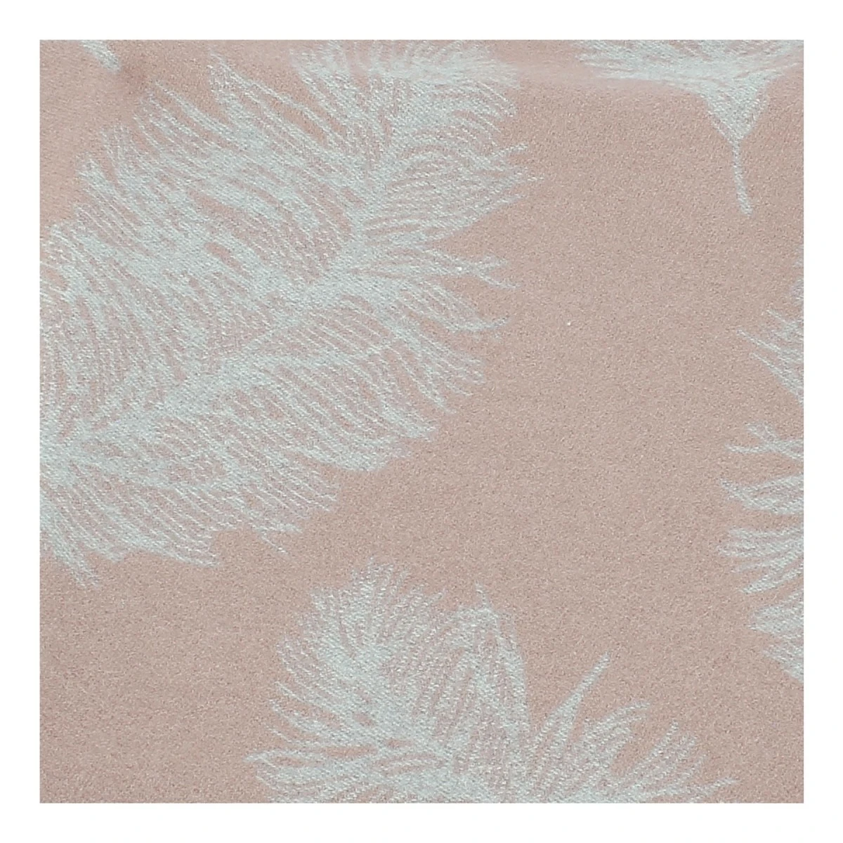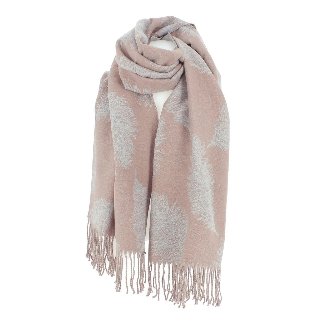 Echarpe femme RODIER « toucher Cachemire », coloris vieux rose motif plumes gris clair. La douceur du Cachemire sans les inconvénients d’entretien.