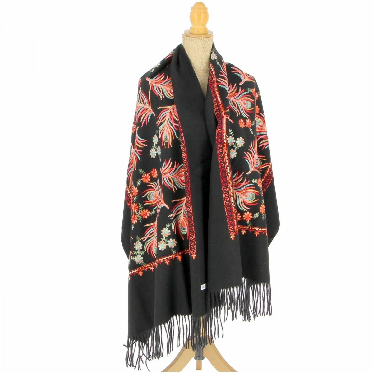 Magnifique étole brodée femme BURTON OF LONDON, réversible avec motifs , coloris noir avec motifs floraux brodés.