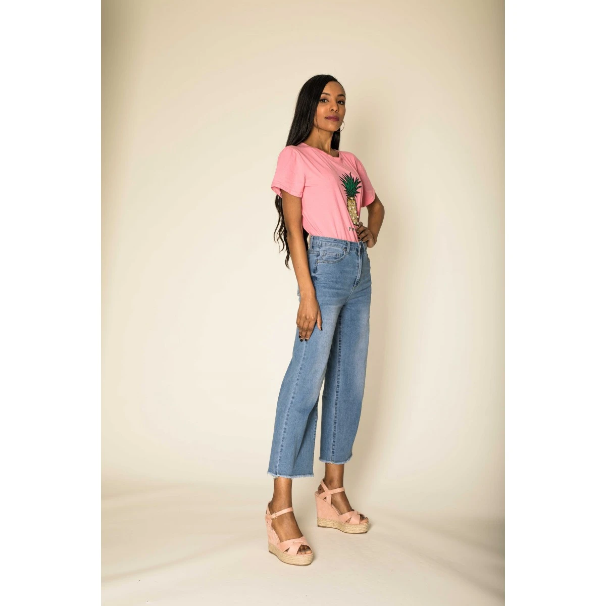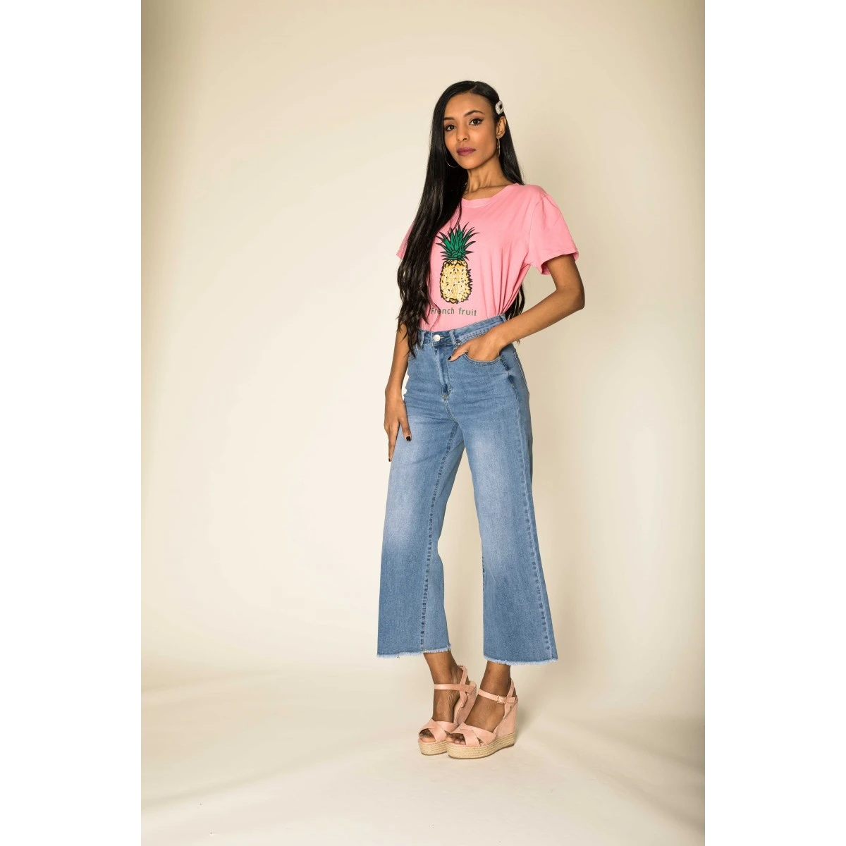 Jean CROPPED large femme Nina Carter, longueur au dessus de la cheville, bas légèrement effiloché, très mode. Taille haute, fermé par glissière et bouton. 2 poches plaquées au dos. Les 2% d’Elasthanne assurent un confort extrême, une aisance dans tous vos mouvements.