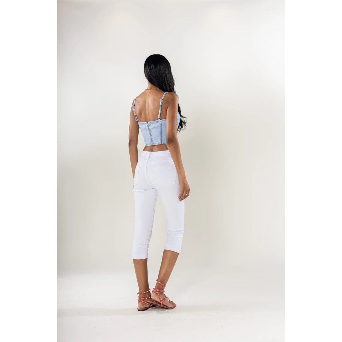 Jean court femme Nina Carter. Coloris blanc. Taille haute, bouton et fermeture éclair. Les 2% d’Elasthanne assurent un confort extrême, une aisance dans tous vos mouvements. A porter avec ou sans revers, à votre guise.