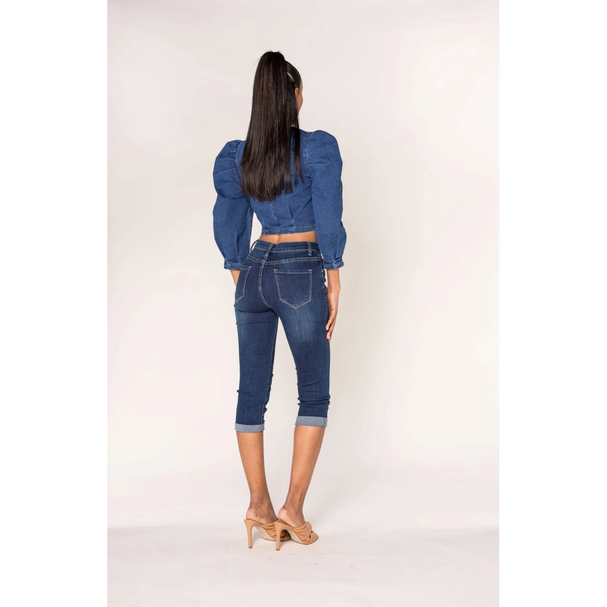 Jean court femme Nina Carter, bleu foncé. Taille semi haute, bouton et fermeture éclair. Les 2% d’Elasthanne assurent un confort extrême, une aisance dans tous vos mouvements.