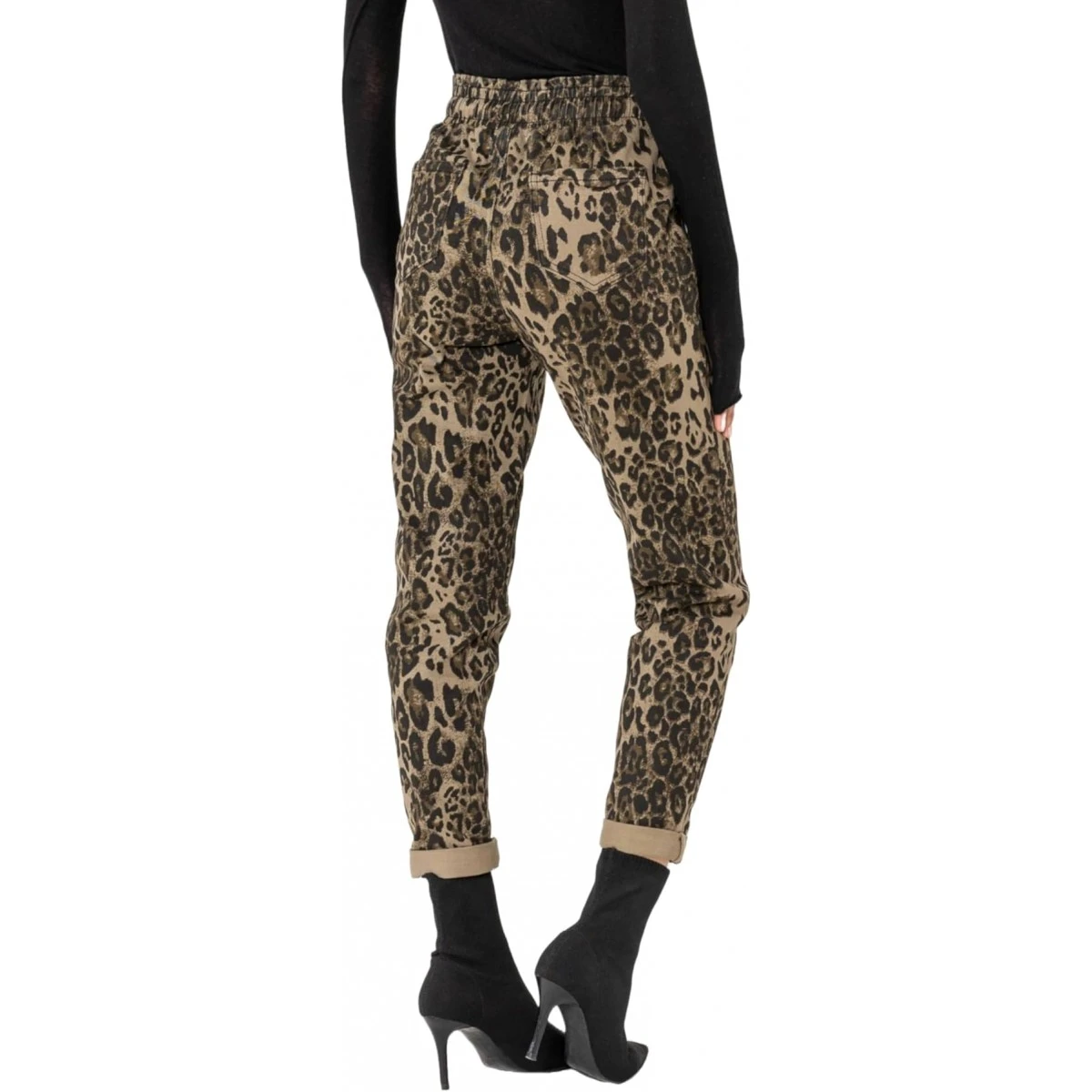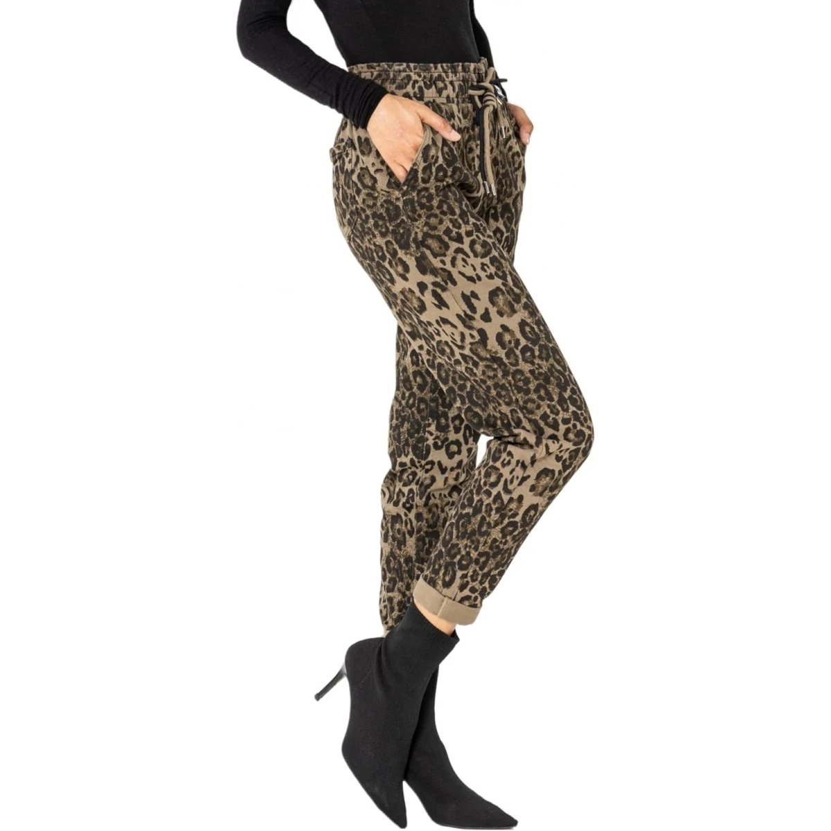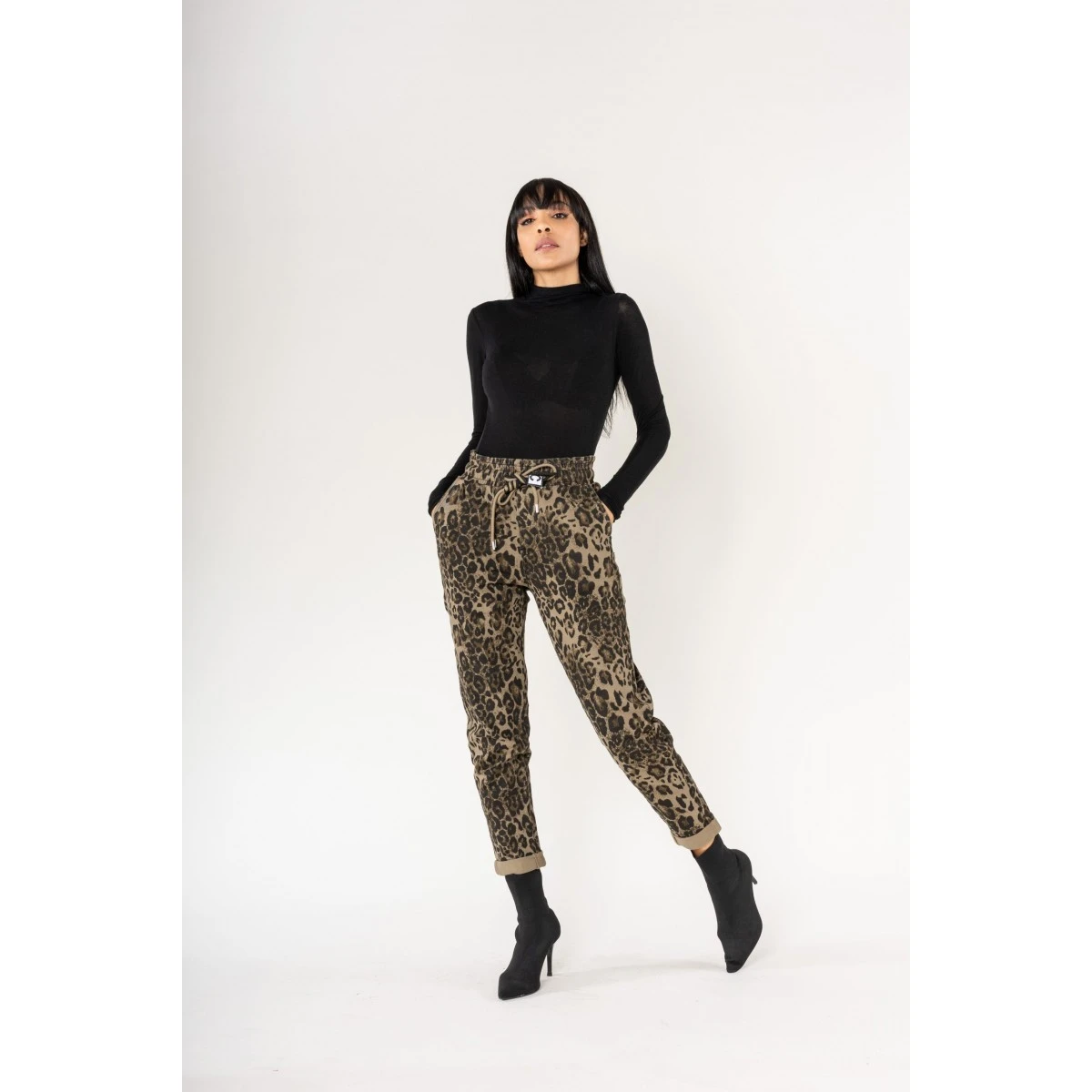 Pantalon ample femme Nina Carter, imprimé léopard, un magnifique camaïeu de tons marrons, kaki foncé, noir.