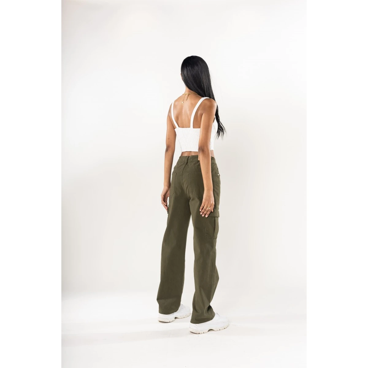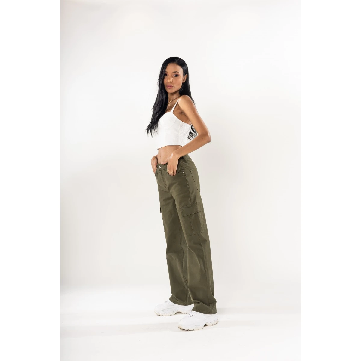 Pantalon cargo large femme Nina Carter, coloris kaki, coupe droite et ample. Taille haute, bouton et fermeture éclair. Les 3% d’Elasthanne assurent un confort extrême, une aisance dans tous vos mouvements. 2 poches à l’arrière et 2 poches à rabats sur les côtés.