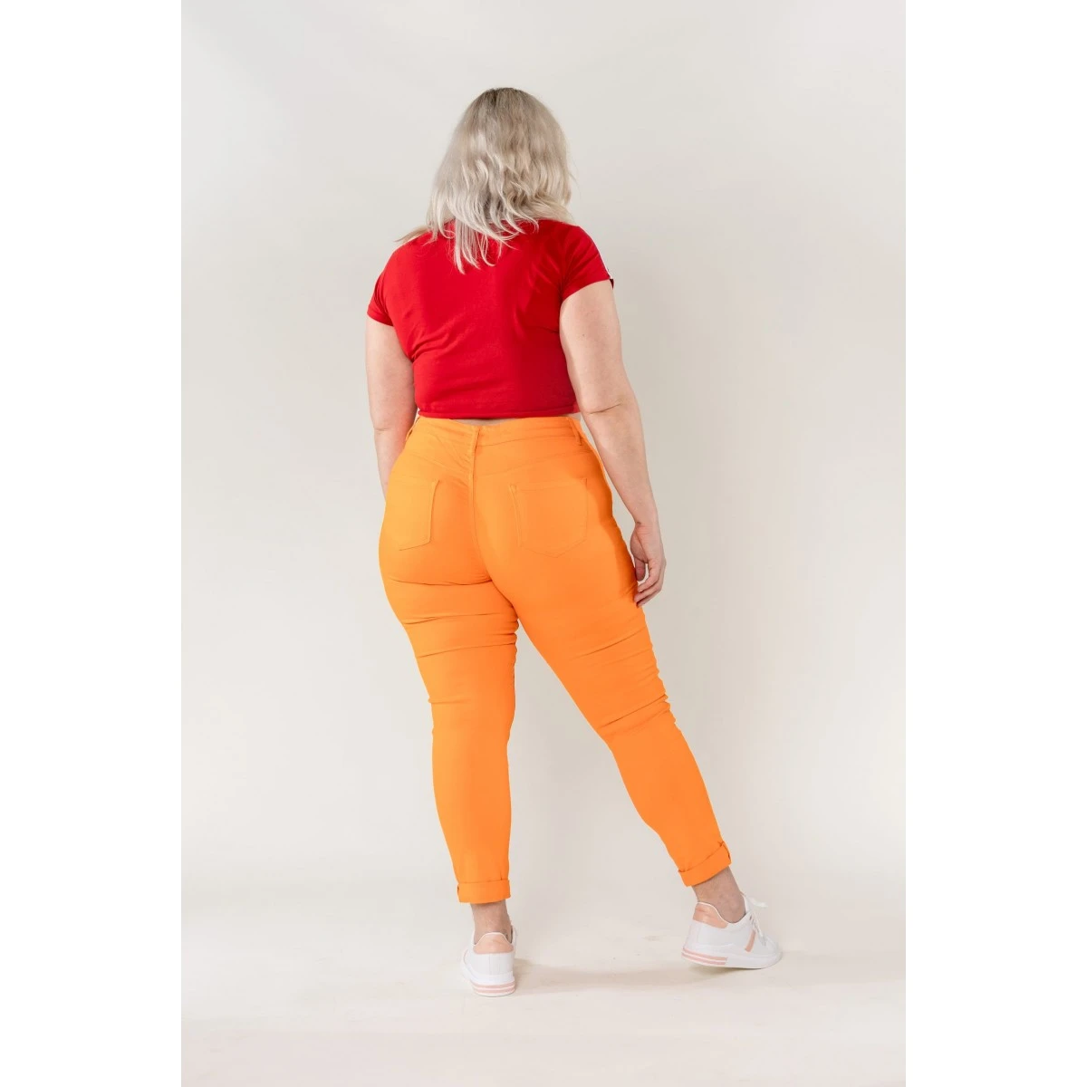 Pantalon stretch Nina Carter, coloris orange. Taille haute, bouton et fermeture éclair. Les 2% d’Elasthanne assurent un confort extrême, une aisance dans tous vos mouvements.