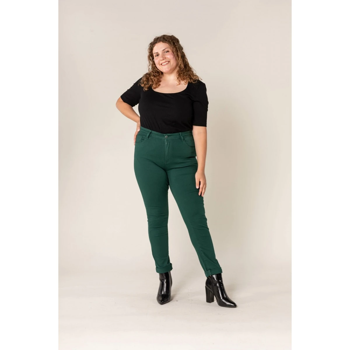 Pantalon stretch Nina Carter, coloris vert sapin. Taille haute, bouton et fermeture éclair. Les 2% d’Elasthanne assurent un confort extrême, une aisance dans tous vos mouvements.