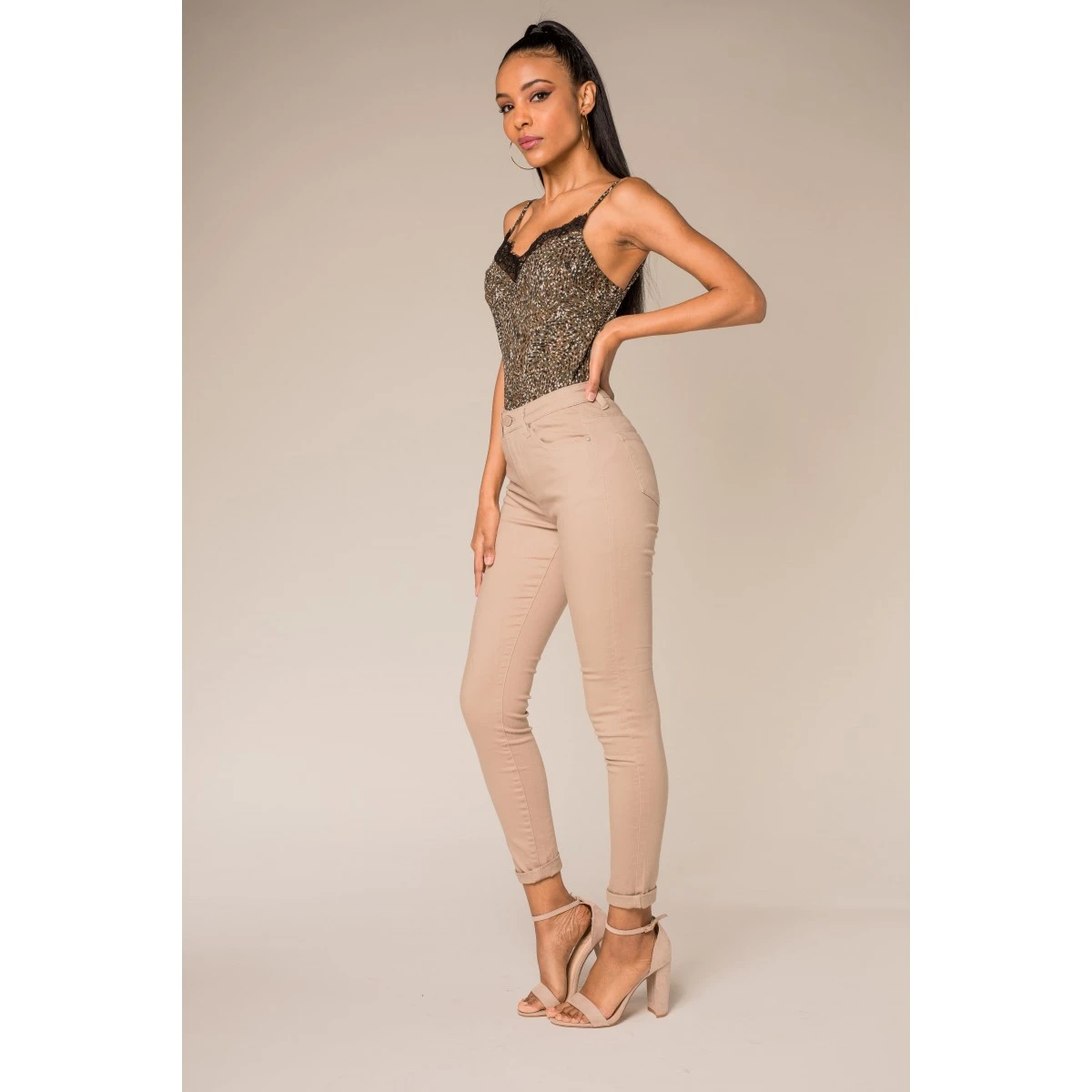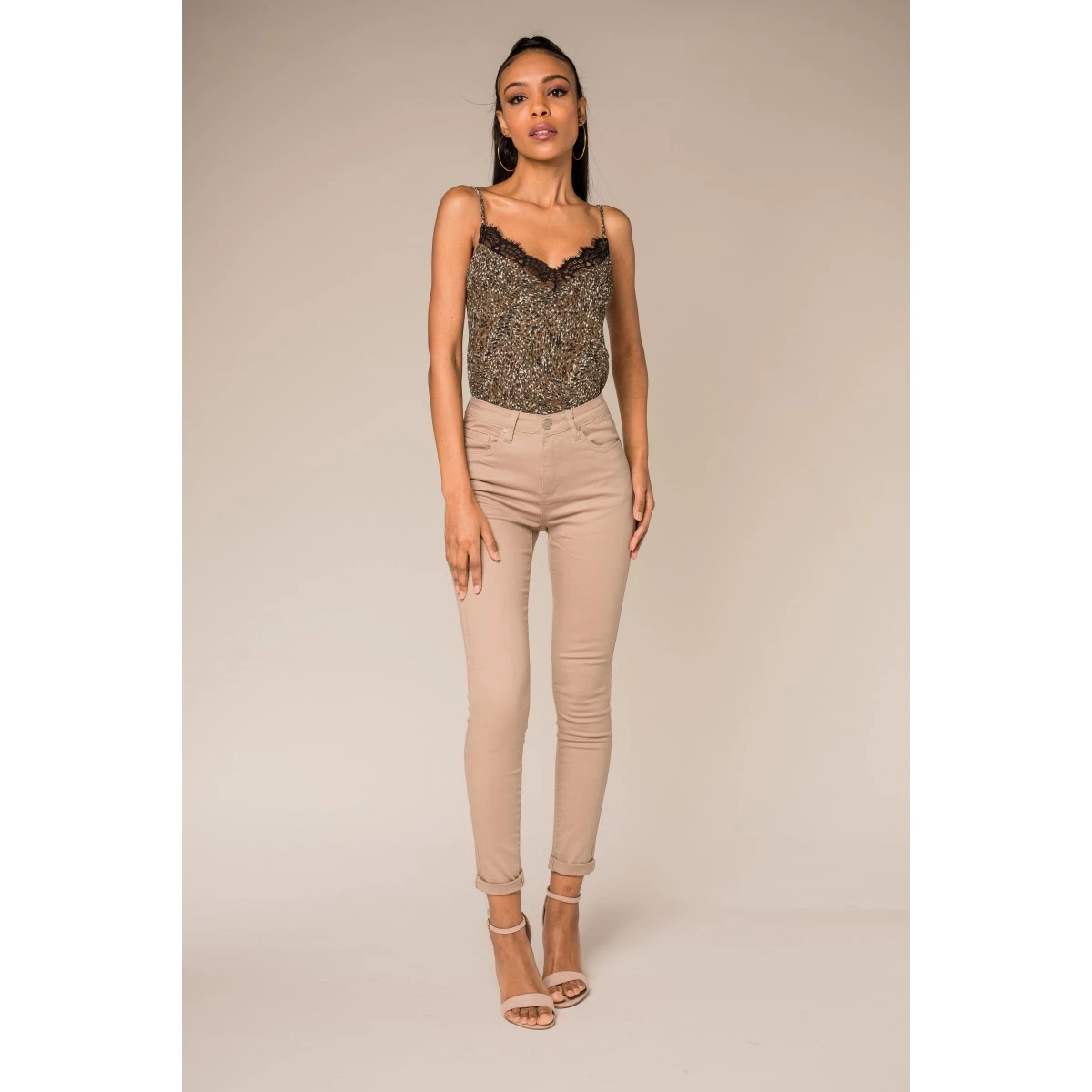 Pantalon slim femme Nina Carter, coloris beige. Taille haute, bouton et fermeture éclair. Les 2% d’Elasthanne assurent un confort extrême, une aisance dans tous vos mouvements. A porter avec ou sans revers, à votre guise.