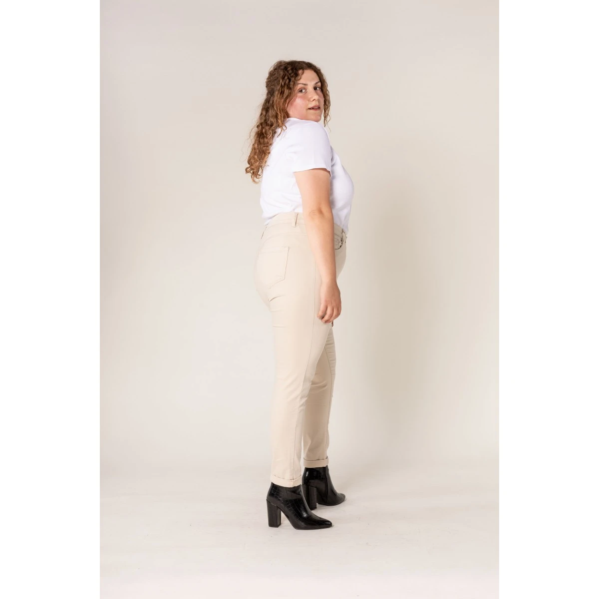 Pantalon femme Nina Carter, coloris écru. Taille haute, bouton et fermeture éclair. Les 2% d’Elasthanne assurent un confort extrême, une aisance dans tous vos mouvements.