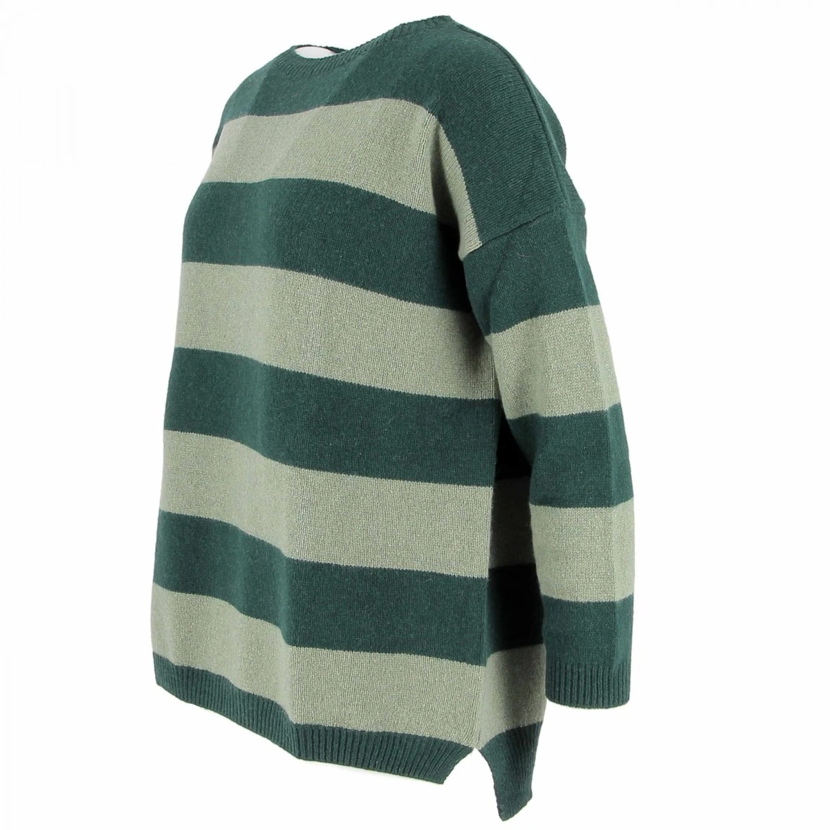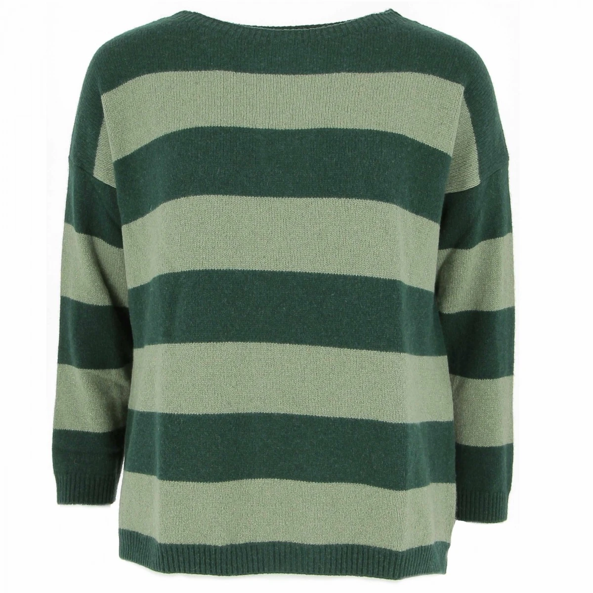 Pull femme en 100% cashmere à larges bandes rayées, coloris vert sapin et amande. Un pull original et de grande qualité.