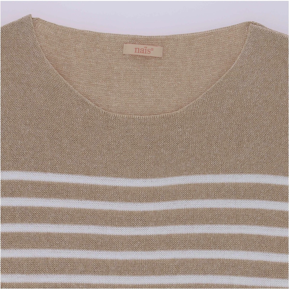 Pull Marinière femme en maille de coton beige et rayures blanches.
