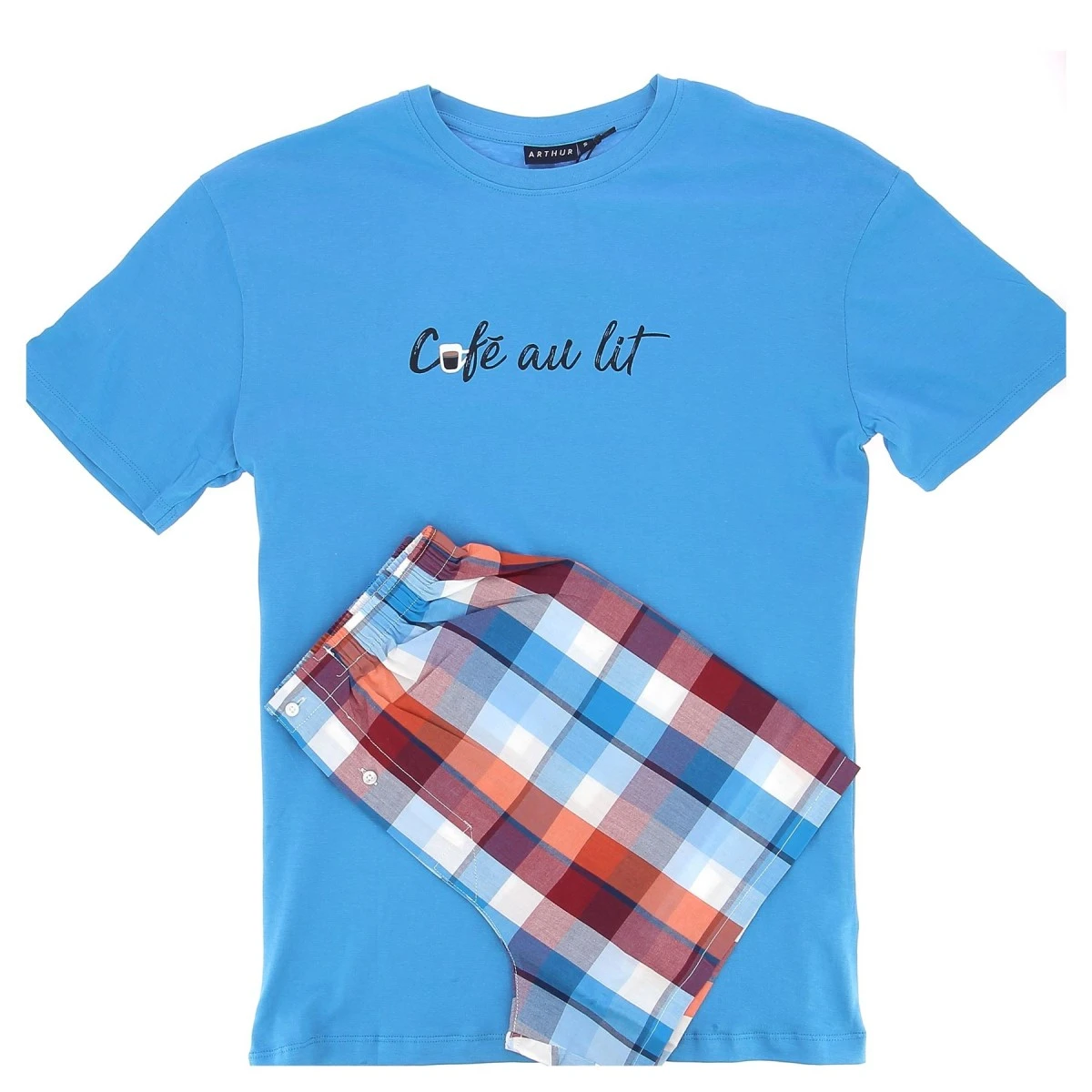 Pyjama short ARTHUR « café au lit » , tee-shirt d’un très joli bleu avec inscription « café au lit », col rond, manches courtes. Short écossais, taille élastique et boutons.