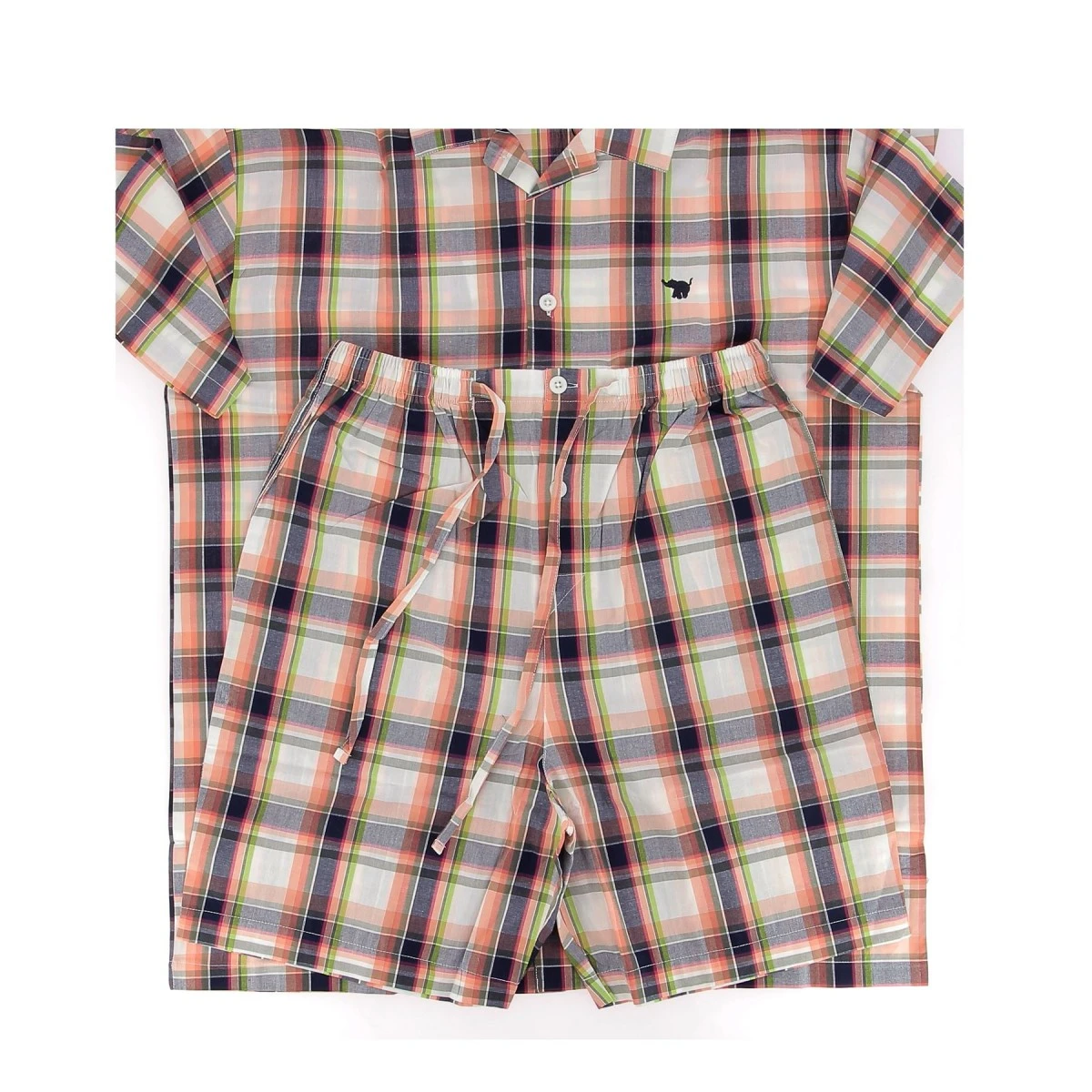 Pyjama short ARTHUR écossais marine, orange, vert ; haut forme chemise fermée par petits boutons, manches courtes, 2 poches plaquées et short taille élastique avec lien de serrage.