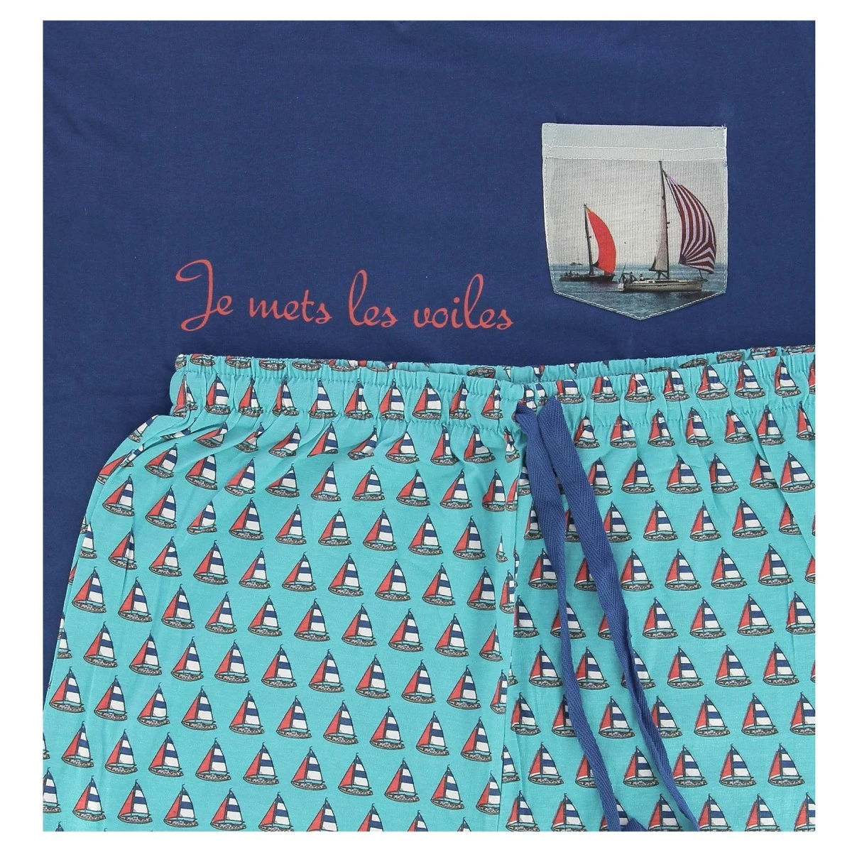 Pyjama short ARTHUR « je mets les voiles » , tee-shirt manches courtes, col en V, coloris bleu et short turquoise avec motifs petits voiliers., taille élastique et lien de serrage. Poche poitrine avec motif.