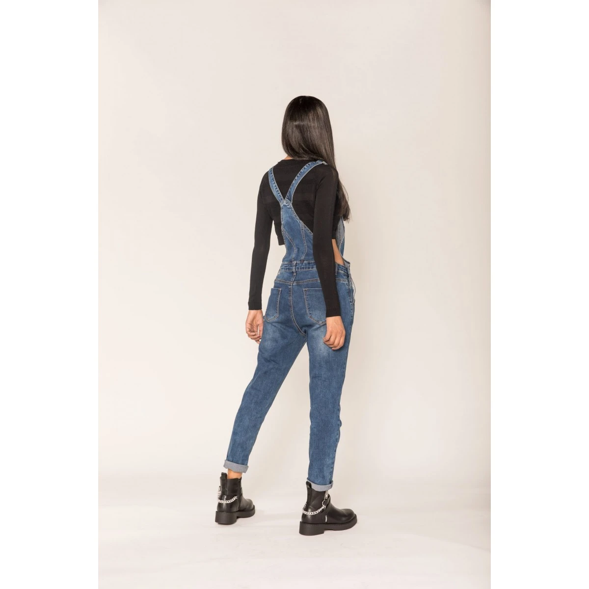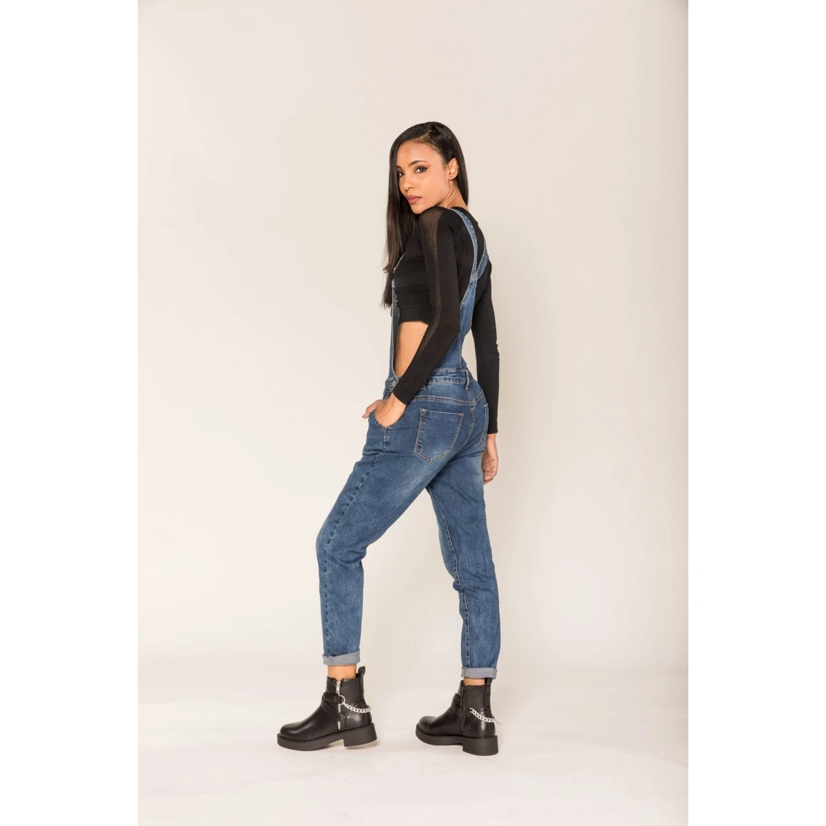 Salopette en jean femme Nina Carter, bleu moyen ! Un look légèrement usé, une coupe Boyfriend hyper confortable. Surpiqures décoratives contrastées. 2 poches plaquées poitrine et dos, 2 poches latérales en biais.