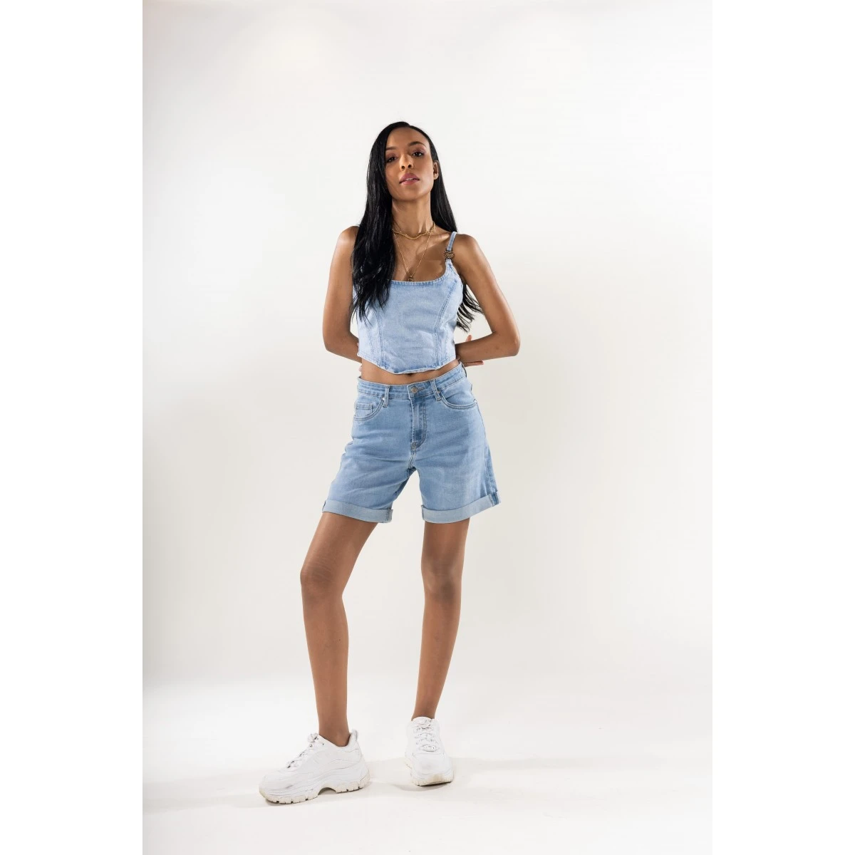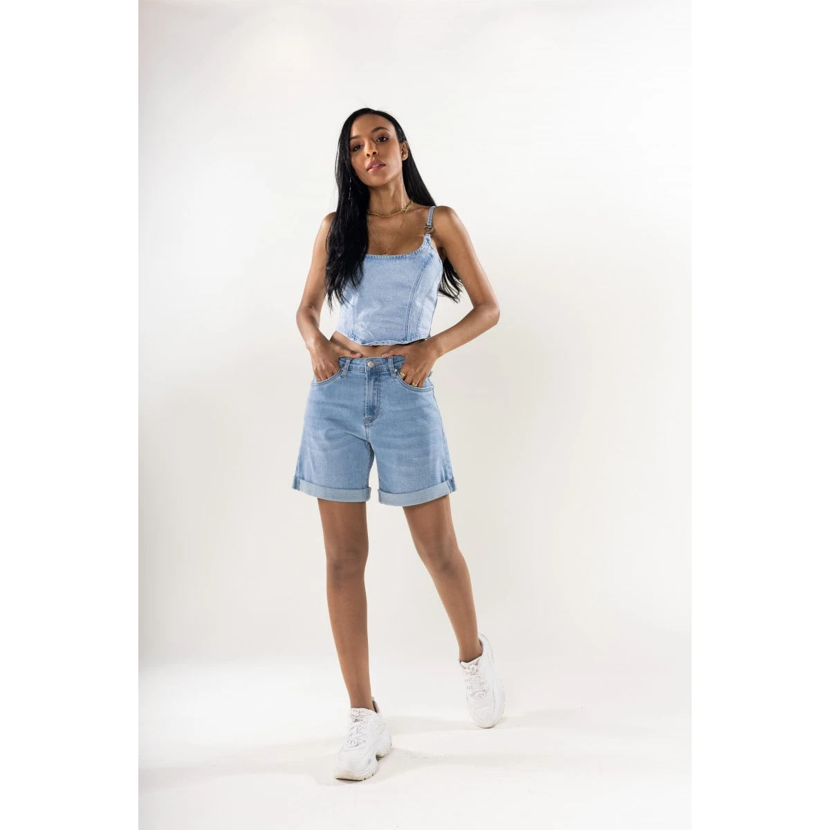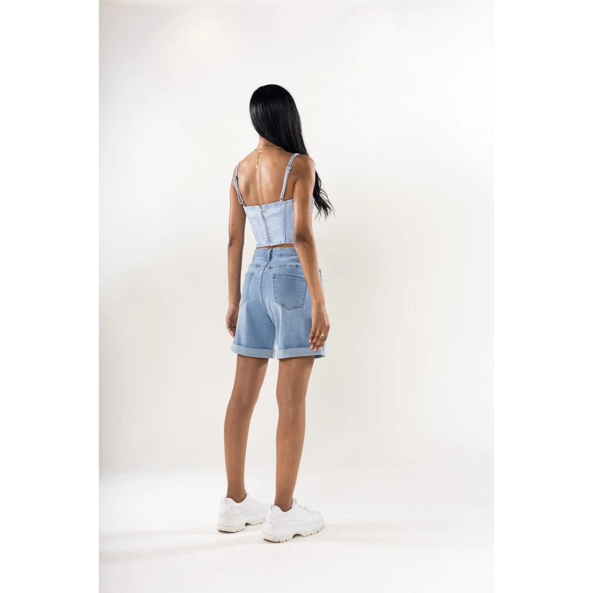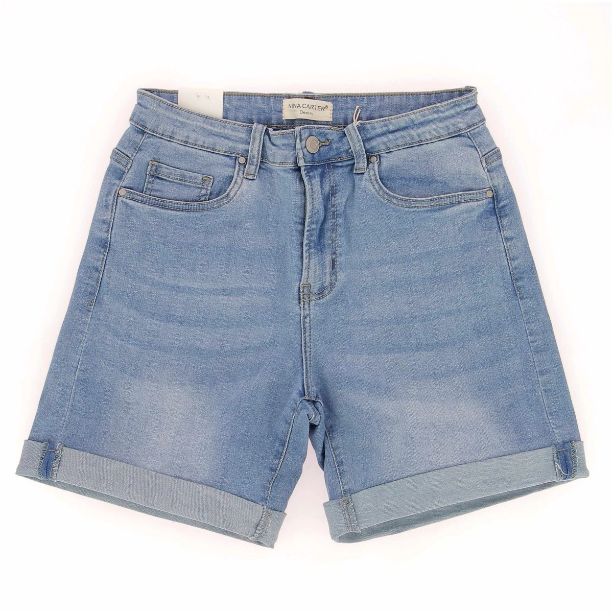 Short en Jean Nina Carter. Taille haute, bouton et fermeture éclair. Revers.