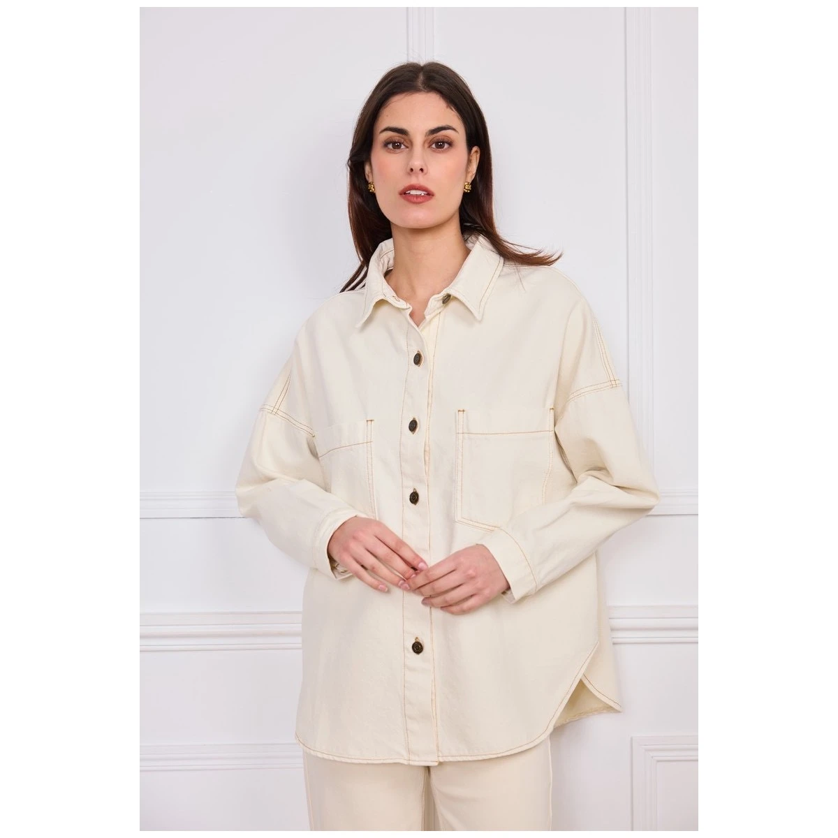 La surchemise en jean femme, coloris écru. Une coupe décontractée, large, fermée par boutons en métal.
