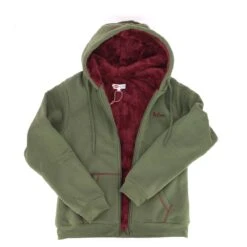 Coloris kaki et intérieur bordeaux. Coutures contrastées sur les poches, taille et poignets en bords côtes. Logo marque poitrine.