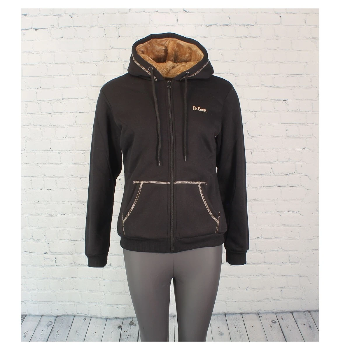 Coloris noir et intérieur Camel. Coutures contrastées sur les poches, taille et poignets en bords côtes. Logo marque poitrine.