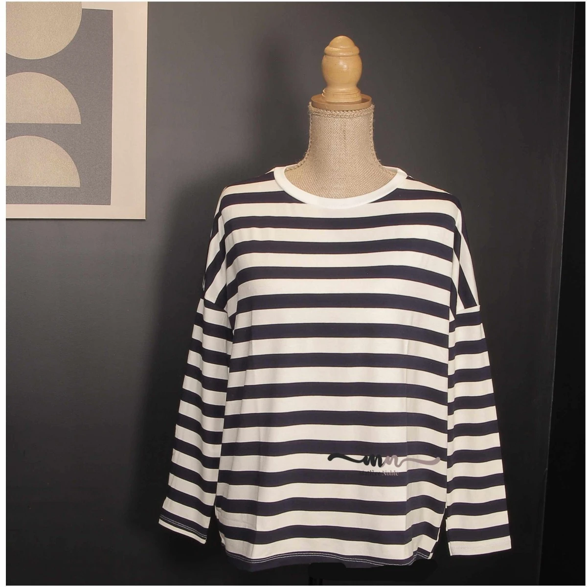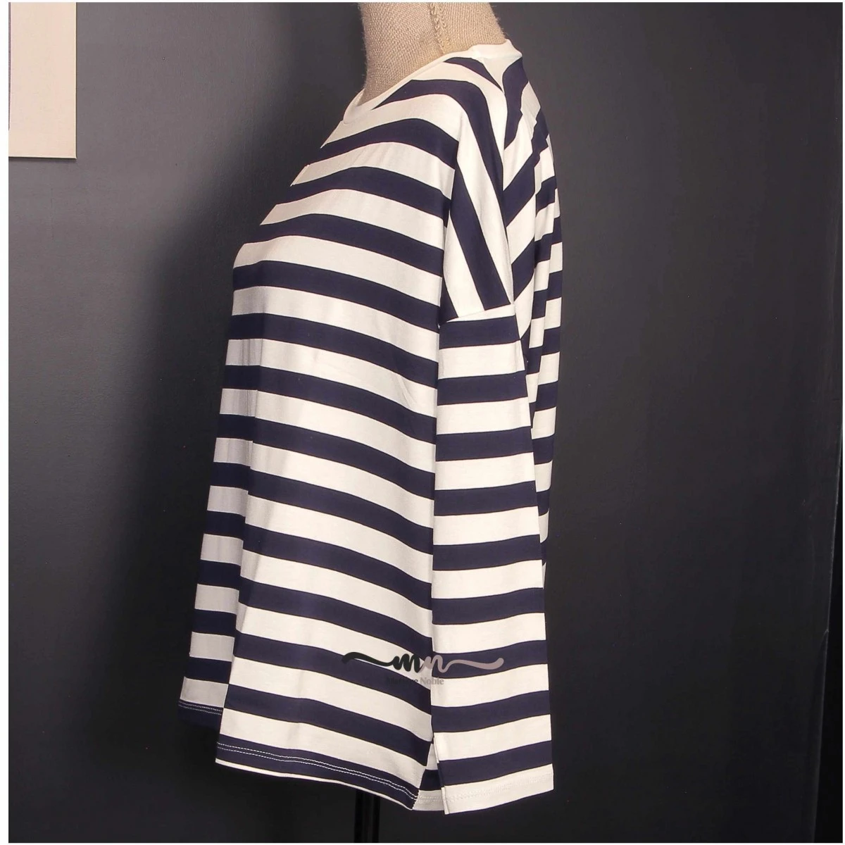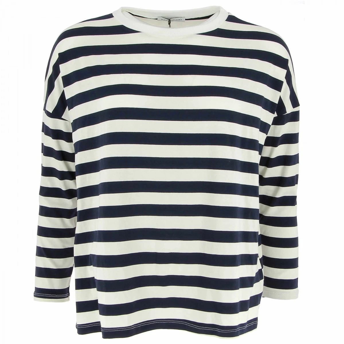 Tee-shirt femme, coloris écru / marine. Une forme plus ample avec de larges rayures pour une touche mode.