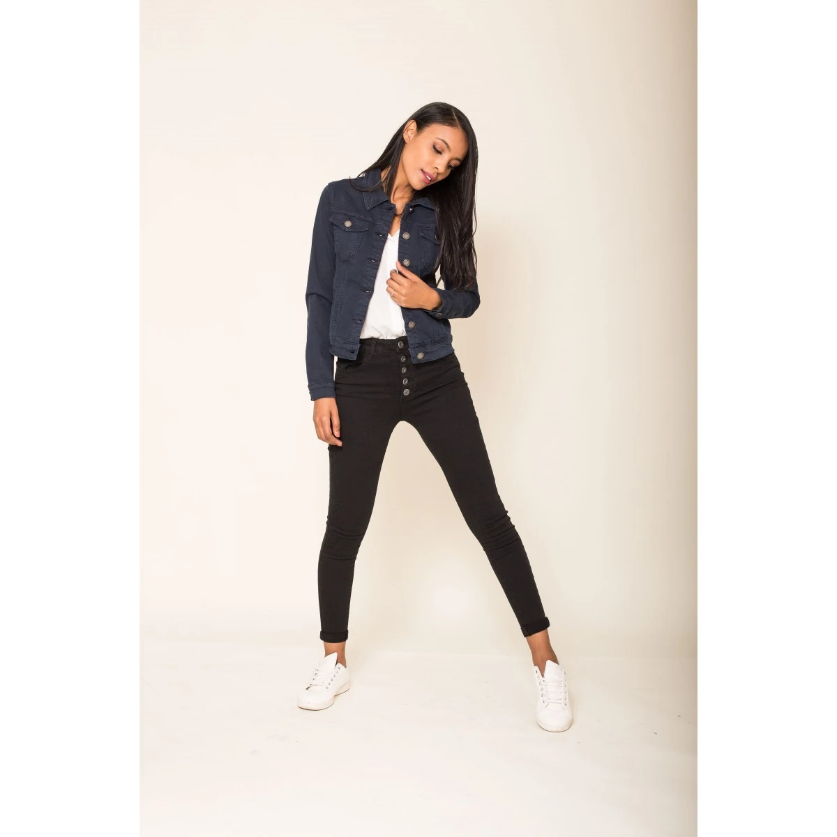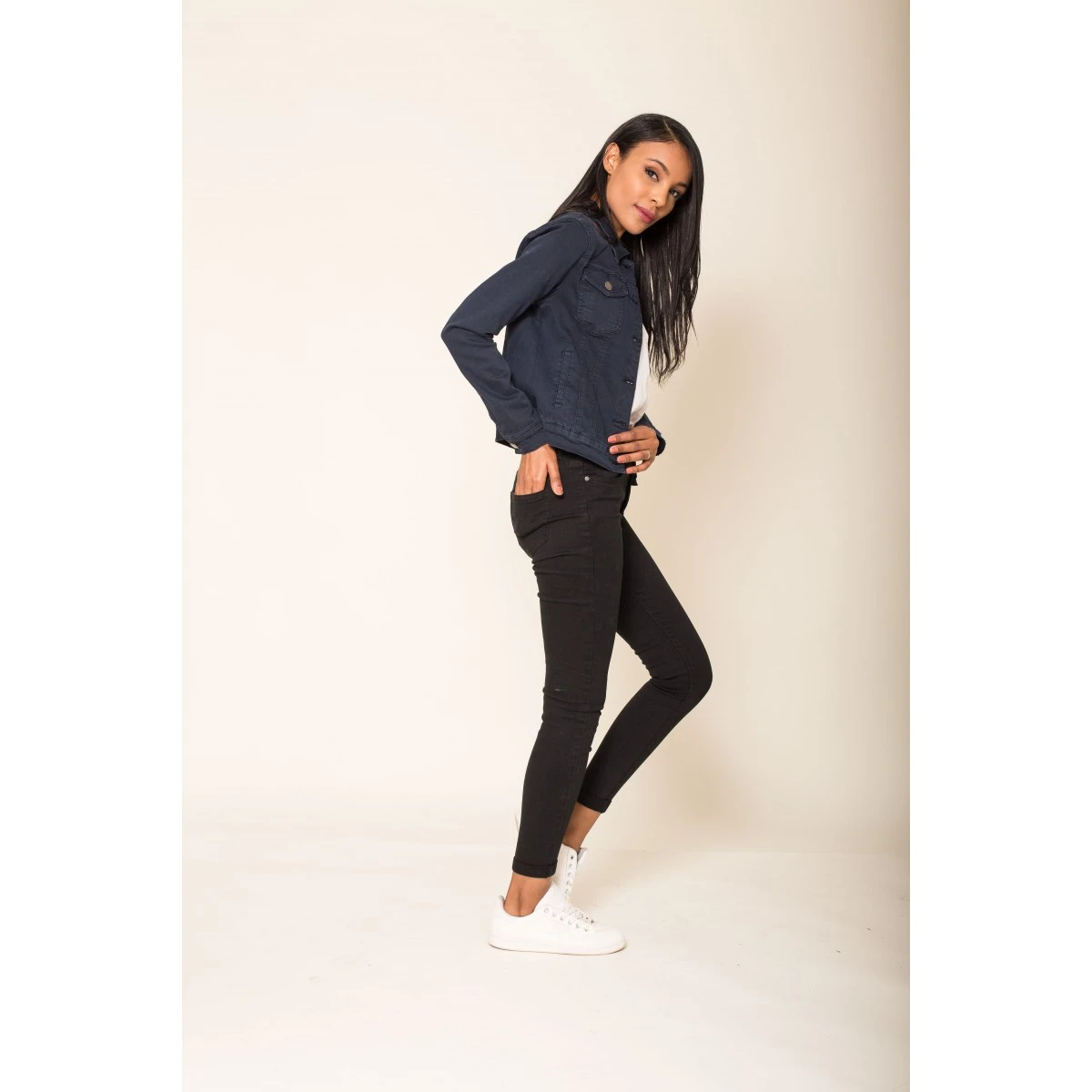 Col chemise et boutons en métal. 2 poches poitrine avec rabat boutonné et 2 poches latérales. En total look jean ou porté sur une robe longue ou courte, il fera son effet en toutes saisons. Sa matière stretch assure un confort parfait.