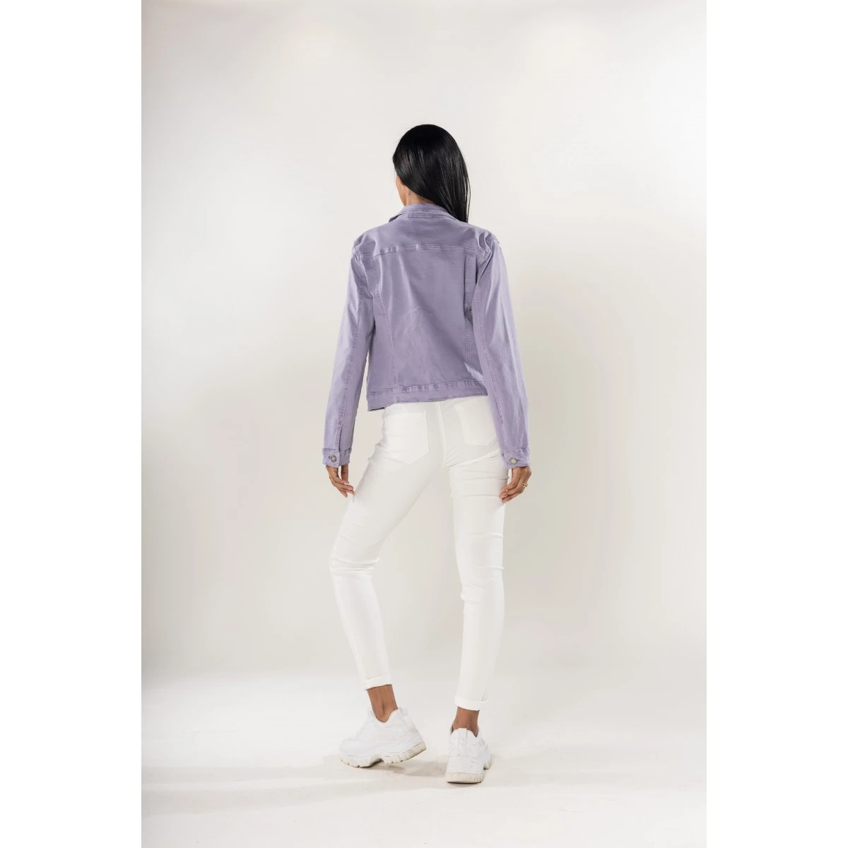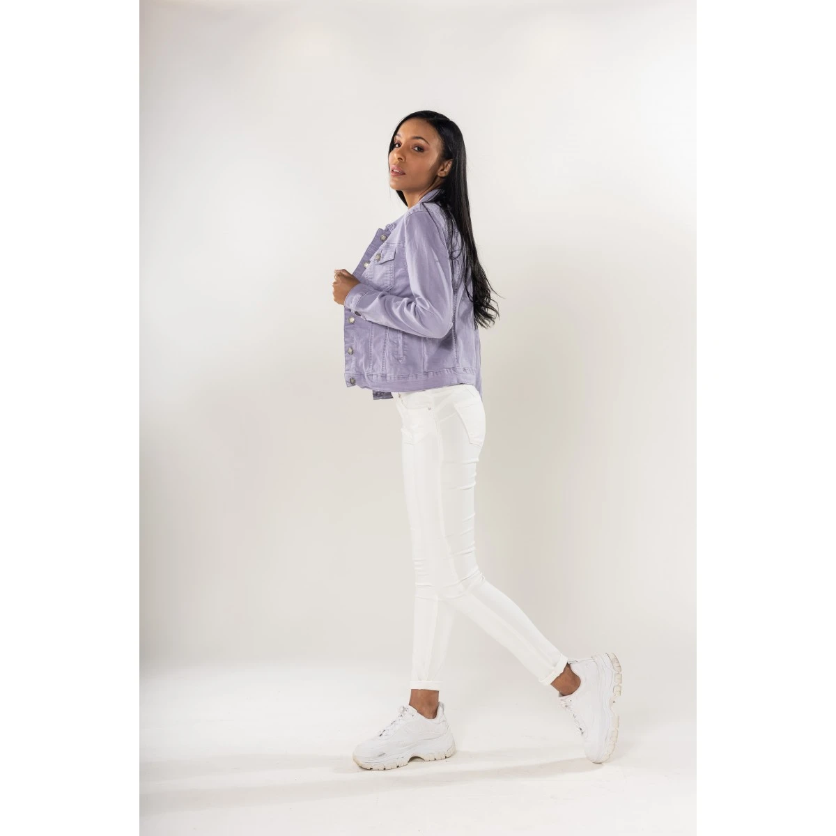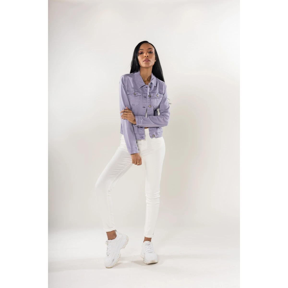 Col chemise et boutons en métal. 2 poches poitrine avec rabat boutonné et 2 poches latérales. En total look jean ou porté sur une robe longue ou courte, il fera son effet en toutes saisons. Sa matière stretch assure un confort parfait.